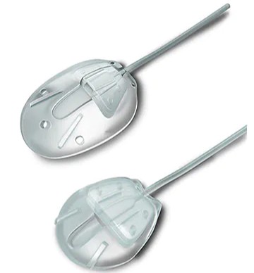 アーメドインプラントは、シリコン製のチューブとプレートから構成されています。プレートを眼球の後方(白目の奥側)に留置し、そこから伸びる細いチューブを眼内に挿入することで、房水(目の中の水)の流れを新たに作り、眼圧を下げる仕組みです。体内に留置されたインプラントは、合併症がない限り長期間使用することが可能です。